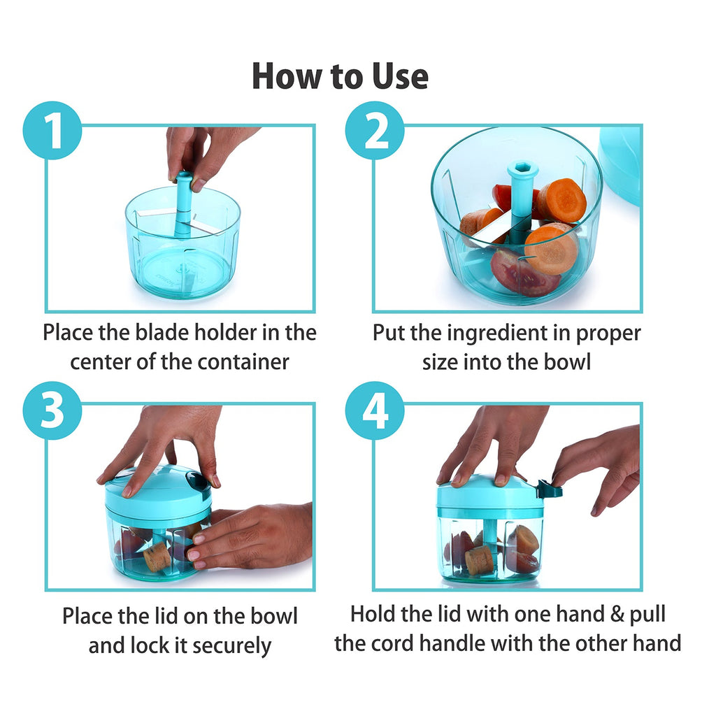 Enrics quick chopper chops All Types of Vegetables and Fruits with Ease:Ganesh Quick Chopper is suitable to cut and chop your vegetables, dry fruits, nuts, etc. into tiny pieces with just few pulls of the chord. Make salad, chatni, gravy, paste, etc. more easily and quickly. This food processor is made of high quality plastic which is safe, smooth and odorless. Easy manual operation make it an alternative to electric chopper.